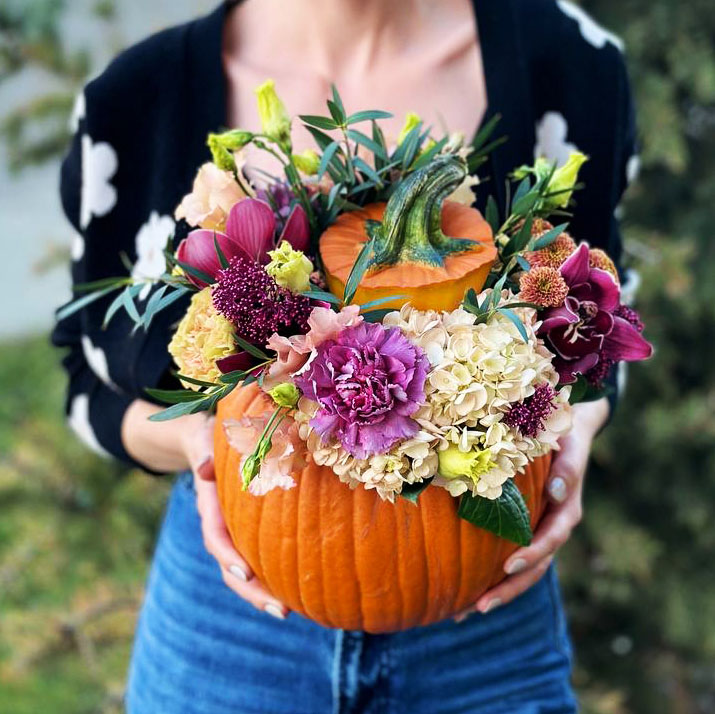 The "Pumpkin Blossom Delight" bouquet is a unique and charming arrangement that pairs the rustic beauty of a pumpkin with vibrant flowers. This delightful bouquet combines the warmth of autumn with the freshness of colorful blooms, making it a perfect centerpiece for fall gatherings. The pumpkin serves as a vase, adding a touch of rustic charm to any setting. With an array of flowers, including sunflowers, daisies, and asters, this arrangement radiates the cozy and inviting spirit of the season. Product Tags: Pumpkin bouquet, fall flowers, sunflowers, daisies, asters, rustic charm, autumn centerpiece